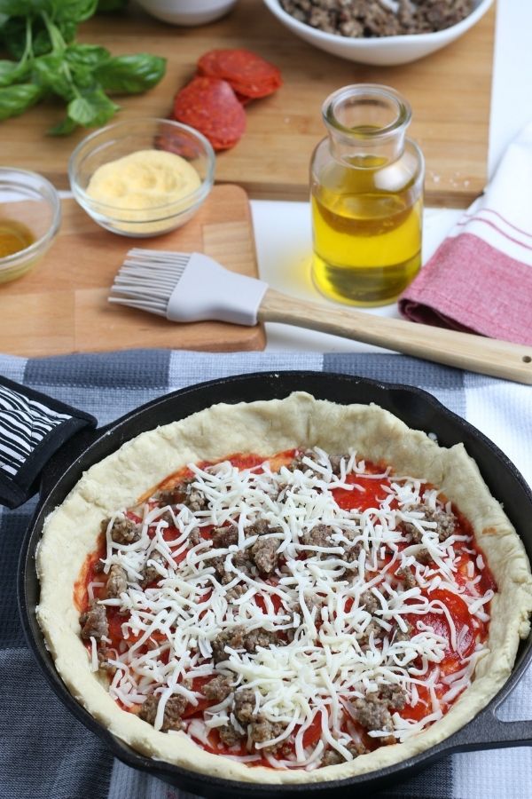 If you don’t have an iron skillet that is okay, you can use an 8×8 baking pan or you can also just make this on a classic pizza pan as well. The cook time will be different as it won’t be as deep dish style but it will still taste incredible.