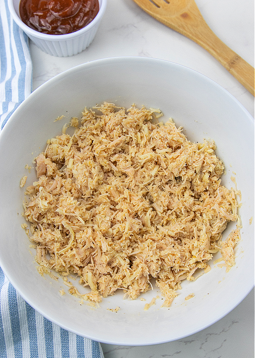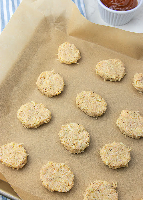 Stir well with a fork and use your hands to mold the chicken mixture into nugget-sized pieces. I used a small cookie scoop and then pressed the chicken tightly together in nugget shapes.