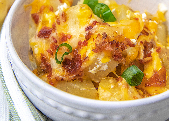 This Loaded Baked Potato Casserole is a favorite side dish at our house! And, it’s a great way to to make loaded potatoes for a crowd, too! Usually we only have this around Thanksgiving or Christmas, but honestly, it would likewise go well with BBQ in the summertime. I’ve also included a way to speed up this recipe if you don’t have a long time to bake your potatoes. Scroll down for the tips!