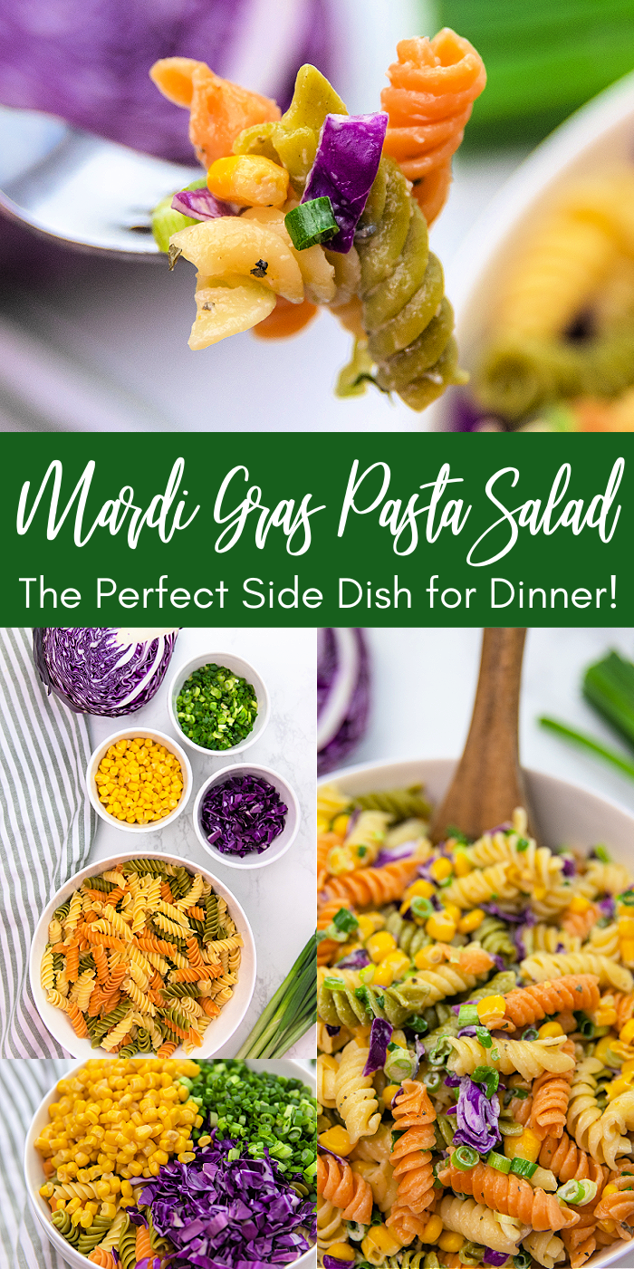 This Mardi Gras Pasta Salad is delicious, colorful, healthy, and festive! With shades of purple, green, and yellow, it’s the perfect savory addition to your Mardi Gras party meal. For me, it’s so easy to find sweet desserts like King Cake for Mardi Gras, but savory recipes and side dishes are much tougher! I am so excited to share this with you guys because it’s so easy to make!