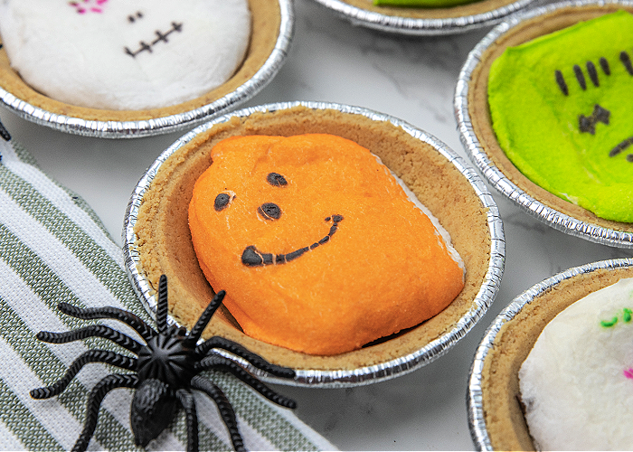 These 3 Ingredient Halloween Peeps S'mores Mini Pies are perfect for kids to have as a treat or to make themselves!