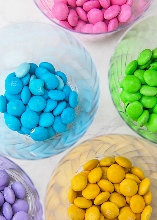 - Separate M&Ms by color and place them in the clear plastic cups.