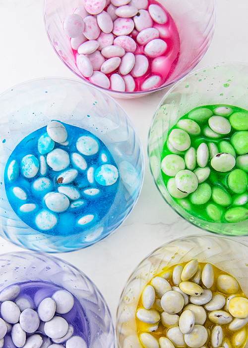 Next, add water to the containers almost to the top of the M&Ms. You don’t want to completely cover them, because the paint will be too watered down and won’t show up properly. After that, hold the cup in your hand and swirl the candies and the water together. The color will come off quickly — less than 10 seconds. Stop swirling once the color is off and scoop out the M&Ms with a spoon. If you let them soak too long, the inner white shell will come off and the chocolate will start breaking apart, too.