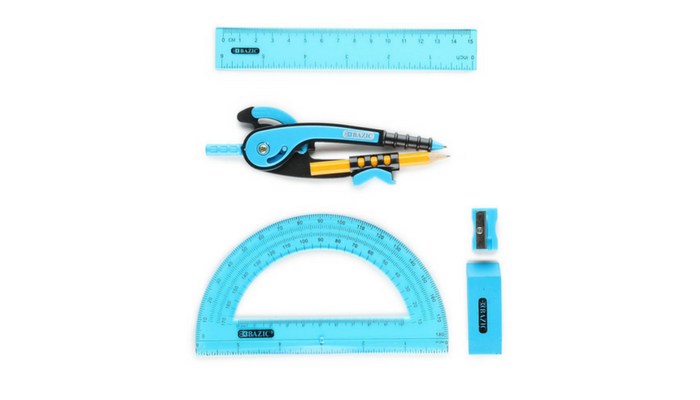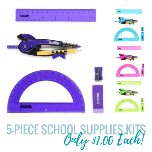 They have the 5-Piece School Supplies Kits in purple, blue, pink, or green, and each one comes with a little pouch to put it all in. They come with a 6” ruler, one 180 degree protractor, one compass with pencil, one eraser, and one sharpener. These 5-Piece School Supplies Kits could sell fast, so hurry and get yours now!
