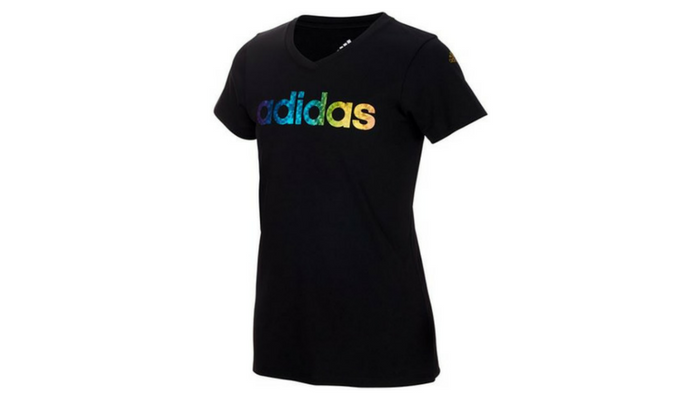 My kiddo loves wearing graphic tees, and this simple yet colorful girls Black Metallic Climalite V-Neck Tee goes perfectly with jeans or leggings. Get this for $10.99.