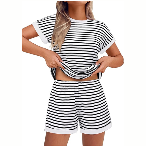 This Ekouer Stripe Knit 2-pc Shorts Lounge Set is cute enough to be pajamas or word to run errands. Some color options are as low as $17.99 (reg $35.99).