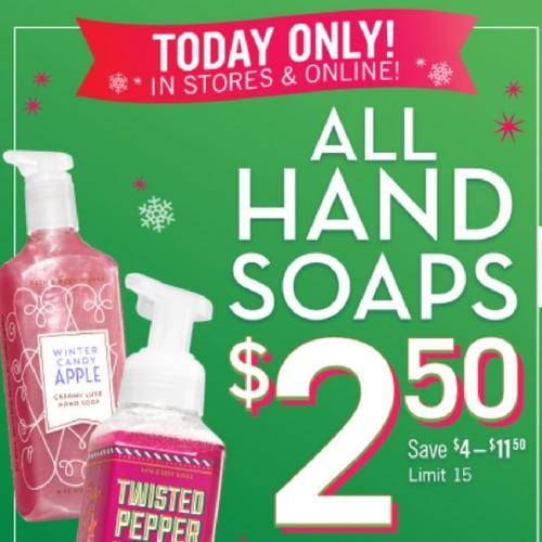 Today Only 11/18/17, the Bath & Body Works Hand Soaps are priced at $60.50 each! Your price will drop to just $2.50 each when with the coupon code HIGHFIVE at checkout. Limit 15. Save $4-$11 on your order!