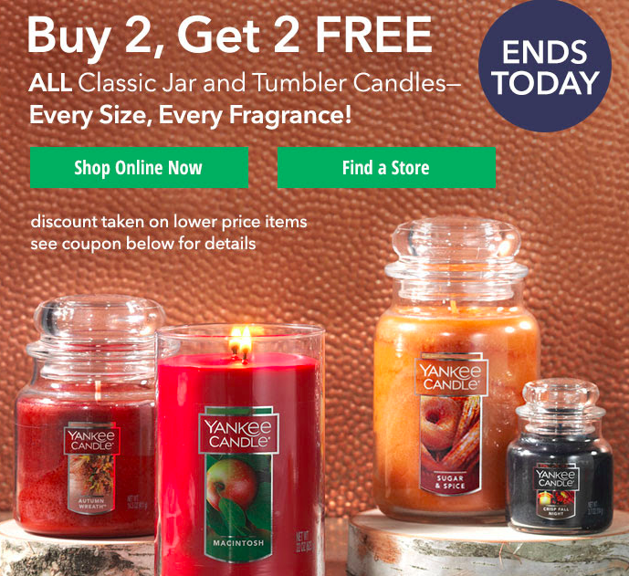 It’s back again and time to stock up! You can get your Yankee Candle gifts ready for the holidays and visiting family for half the price with the Buy 2 Get 2 Free Yankee Candle Coupon. Be sure to print your Yankee Candle Printable Coupon to use in-stores.