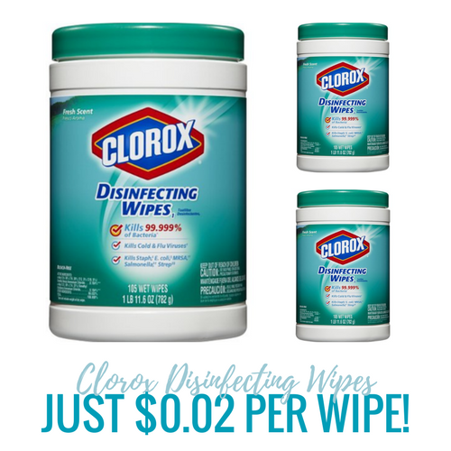 There is a 4 pack of 105 ct. Clorox Disinfecting Wipes priced at $12.07 with Subscribe and Save and when you clip the 20% off Clorox Wipes Coupons, you will pay just $9.66. That comes out to $2.41 per canister or $0.02 per wipe SHIPPED!