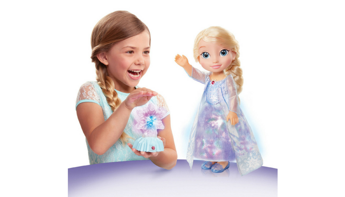 Provide a child with a sweet companion to call her very own with this charming Disney Frozen Northern Lights Elsa. It is made of kid-friendly materials and provides kids with a fun way to play out their very own Frozen adventures. She features several points of articulation that include her arms and head. Kids can simply wave a hand over the included snowflake to create beautiful colors, sounds and Disney Northern lights. Elsa comes wearing her iconic character dress, a coordinating removeable snowflake coat and matching shoes. She lights up and sings “Let It Go” and says 40 fun phrases from Disney’s Frozen. She can be paired with additional Frozen dolls, which are sold separately, to add to the fun. Ideal for a child or doll collector, this Disney Frozen lights play set is recommended for kids who are 3 years old and older.