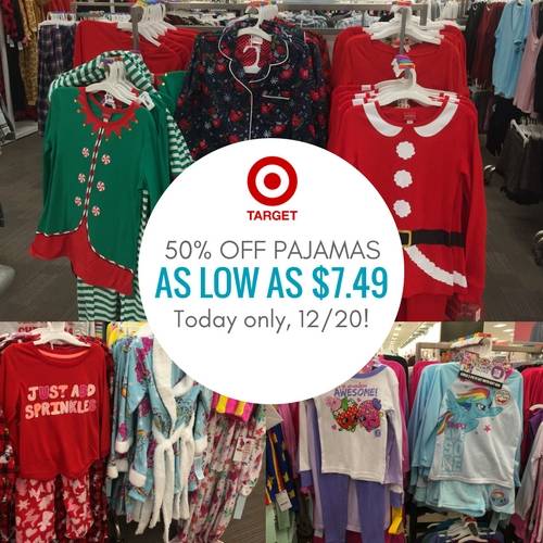 Hurry over to Target online where they are offering 50% off Target Pajamas today only, 12/20! If you have Target REDcard, you will get an additional 5% Discount! Sign up for REDcard here. They also look like they have Free Shipping, or you could pick them up in store to make sure you get them before Christmas!