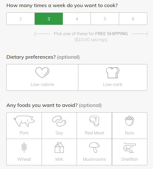 When I placed my order, I was able to choose how many people I wanted to cook for, and shipping was free when I chose 3 or more meals per week! There are also options for dietary preferences and foods to avoid if you have any allergies :)