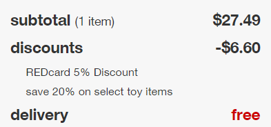 When you factor in the 20% off toys discount and the 5% off Redcard discount your price will drop to just $20.89 plus you’ll get Free Shipping or you can always pick up in store if you prefer.