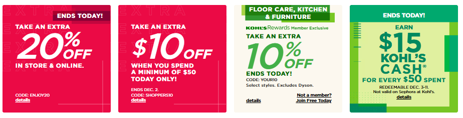 - $15 in Kohl’s Cash for Every $50 Spent thru 12/2