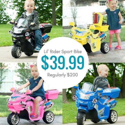 There are several different colors of the Lil’ Rider 3-Wheel FX Sport Bike Ride On priced down to just $39.99 today. These are normally $200, and would be a huge hit to wake up to on Christmas morning :)