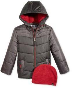 This warm Norris Hooded Puffer Coat with Hat set comes in two colors that boys will love.