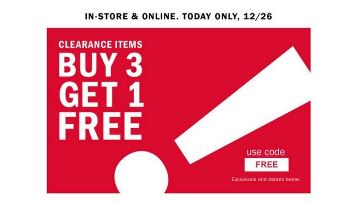 Buy 3 Clearance Items, Get 1 Clearance Item Free: Offer valid while supplies last from 12/26/17 at 12:01 am ET through 12/26/17 at 11:59 pm ET at Old Navy stores and Old Navy online at oldnavy.gap.com in the US only (including Puerto Rico).Offer valid on Clearance merchandise only (merchandise ending in $.47 and $.97 online). Fourth item must be of equal or lesser value than each of the other three items. Discount taken at checkout. Discount is allocated across items.