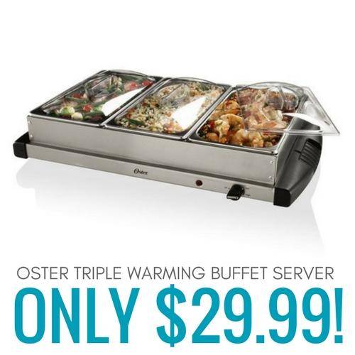 The Oster Triple Warming Buffet Server is priced down from $50 to only $29.99 and it has 4.5 out of 5 stars! It has three 2-1/2-Quart buffet pans with lids and a stainless steel warming tray with 20-Inch by 13-Inch heating surface that can be used separately.
