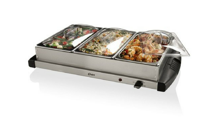 The Oster Triple Warming Buffet Server is priced down from $50 to only $29.99 and it has 4.5 out of 5 stars! It has three 2-1/2-Quart buffet pans with lids and a stainless steel warming tray with 20-Inch by 13-Inch heating surface that can be used separately.