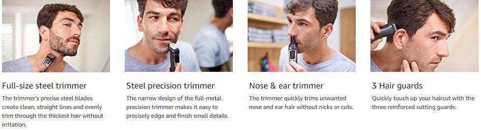 - 13 attachments for all of your grooming needs: Full size steel trimmer, a steel precision trimmer, a nose and ear hair trimmer, 3 hair trimming guards, 3 beard trimming guards, a stubble guard, an accessory travel storage bag, and a cleaning brush. Unlike competition, no oil needed to maintain high quality performance Blades and Guards are easy to detach and rinse