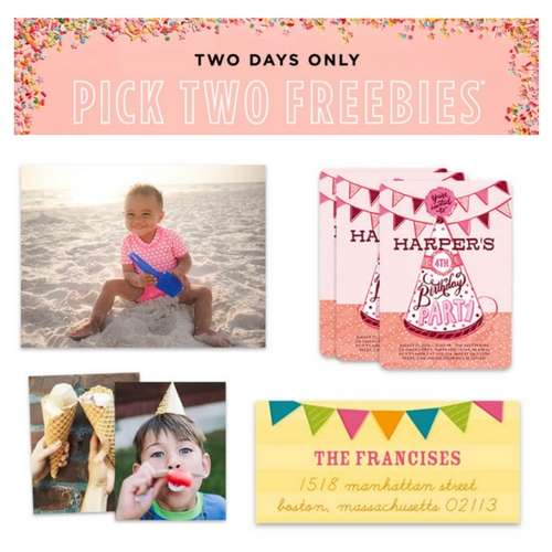 Pick one or two free products (products selected must be different) from the following choices: Two 8×10 prints (glossy/matte), one 16×20 print (matte), 10 free square trim, signature cardstock cards (6×8 flat, 5×7, 5×5, 4×8, 5×7 folded or 5×7 trifold) and/or one set of address labels through shutterfly.com, our mobile-friendly site or Shutterfly app (only select products are available on the app).