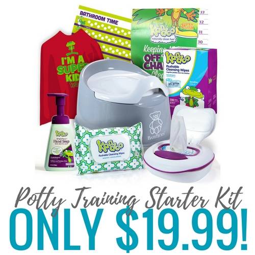 The Potty Training Starter Kit comes with all of the following: Baby Bjorn Smart Potty, Kandoo Flushable Wipes (Total of 342 Wipes), 6 Refill Packs (300 Wipes), Travel Pack (42 Wipes), and Potty Training Chart. That is a LOT of great stuff, and you will pay just $19.99! This is selling fast, so hurry!