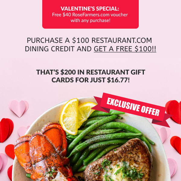 Don’t miss out on this fabulous deal from Restaurants.com! In celebration of Valentine’s, they are offering a Free $100 Gift Card when you purchase a $100 Gift Card for just $16.77 + a Free $40 Rosefarmers.com voucher!! You guys… That’s $200 in Restaurant.com gift cards + a FREE $40 Rosefarmers.com voucher all for just $16.77! You seriously cannot beat that price. Where can you even go for one meal nowadays for less than $16.77!? Seriously, it’s a steal. And what a great gift idea! It’s a great way to save money when you take your Valentine out!:)