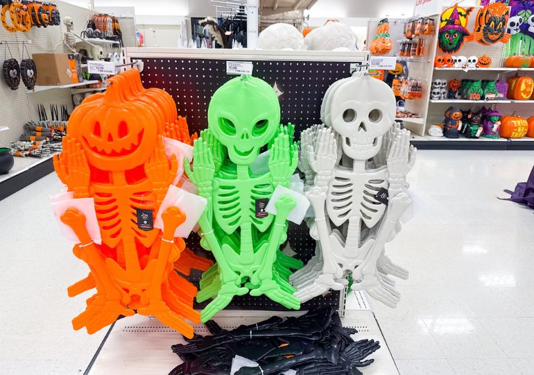 This skeleton comes in 3 colors – white, orange and green. I love that they all have different faces – skeleton, alien and pumpkin.