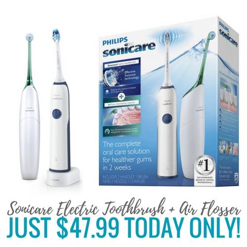 I know several of you missed the air flosser the last time it came up on sale, and it’s in an awesome combo deal! The Sonicare Essence Electric Toothbrush + AirFloss Electric Flosser set is on sale for 40% off today only on Amazon!