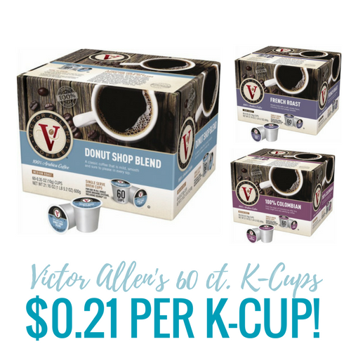 The Victor Allen’s 60 ct. K-Cups are on sale for just $12.49, down from the regular price of $24.99. That is only $0.21 per K-Cup which is more than HALF my stock up price of $0.50 per K-Cup! It looks like they have French Roast, Donut Shop Blend, and Columbian all at that price!
