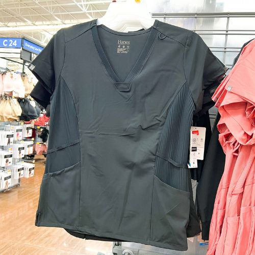 While you already know I am in love with the pink, you can never go wrong with a classic black. It looks so professional and is great for strict standards. The seams are ultra-slimming. Everyone will be shocked that they are Walmart scrubs! Grab the Hanes ComfortFit Stretch Women’s Vneck Rib Scrub Top for $19.98 (was $24.99).