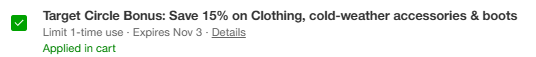 Target Circle Bonus: Save 15% on Clothing, cold-weather accessories & boots Coupon (clip the coupon)