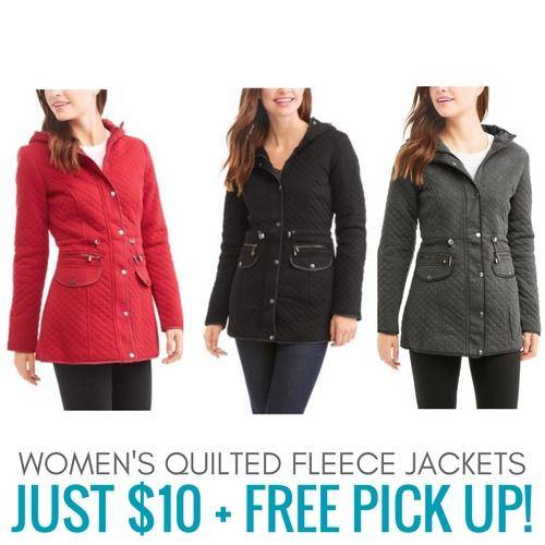 The Women’s Quilted Fleece Jacket comes in black, charcoal, heather grey, or red for just $10, and you can get Free Store Pick Up on your order.