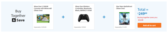 First off, after you go here, scroll down until you see the “Buy Together & Save” option and click add all to cart. The Xbox One S Minecraft Bundle comes with a Bonus Controller and the Star Wars Battlefront Game all for $249! The controller and game are each worth around $60, so that is a huge value! You also get Free Shipping on your order, or you can pick it up at your local Walmart with Free Store Pick Up if you want to go grab it yourself!