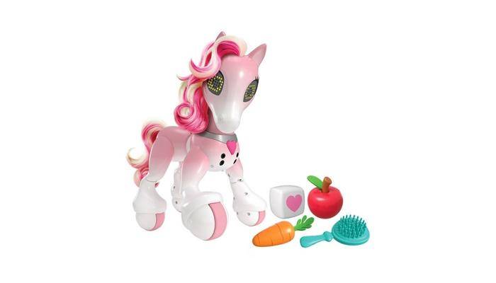 The new Zoomer Show Pony is a fashionable, interactive pony you can feed, groom, and train to perform different tricks. She moves on her own and has expressive light-up eyes that show you exactly how she feels. Zoomer Show Pony knows when you’re petting her cheeks and nose, and responds with loving pony sounds. She’ll nuzzle into your hand, shake and move her head, and even neigh “I love you.” When you press the heart badge on her chest, she’ll perform tricks, including dancing, singing or doing a figure eight. Zoomer Show Pony comes with four interactive accessories, including an apple, carrot and a sugar cube. Try feeding your pony an interactive apple and she’ll crunch, chomp and munch happily! Use the hairbrush accessory to brush and style her, so she’s ready for the big show!