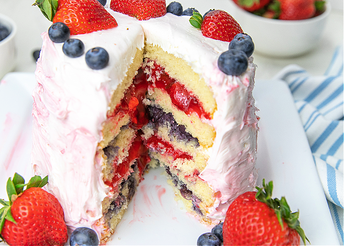 This Patriotic Berry Cake has delicious alternating ayers of blueberry and strawberry filling. Topped off with strawberry frosting, this is a delightful and lovely dessert for your 4th of July celebrations!
