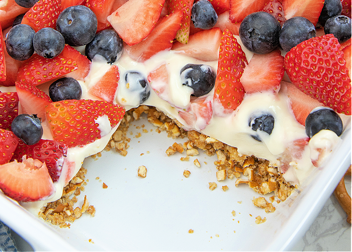Patriotic Pretzel Salad combines a salty sweet brown sugar crust with creamy whipped cheesecake and fresh fruit! Easy 4th of July side!