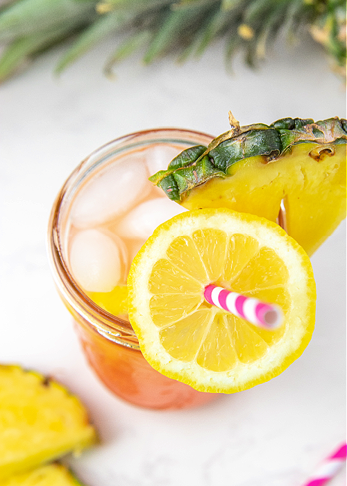 - Garnish with pineapple and lemon slices and a pink straw, if desired.