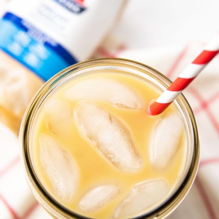 - Fill a glass or jar halfway with ice. Add 8 oz coffee and all or part of a protein shake. (We used Atkins Vanilla flavor!)