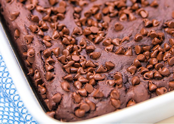 Sprinkle the chocolate chips on top of the cake evenly. Bake for about 30 minutes, or until cooked through.