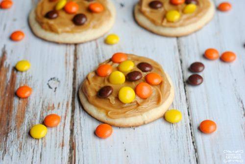 - Frost each cookie when cooled and sprinkle with Reese's Pieces.