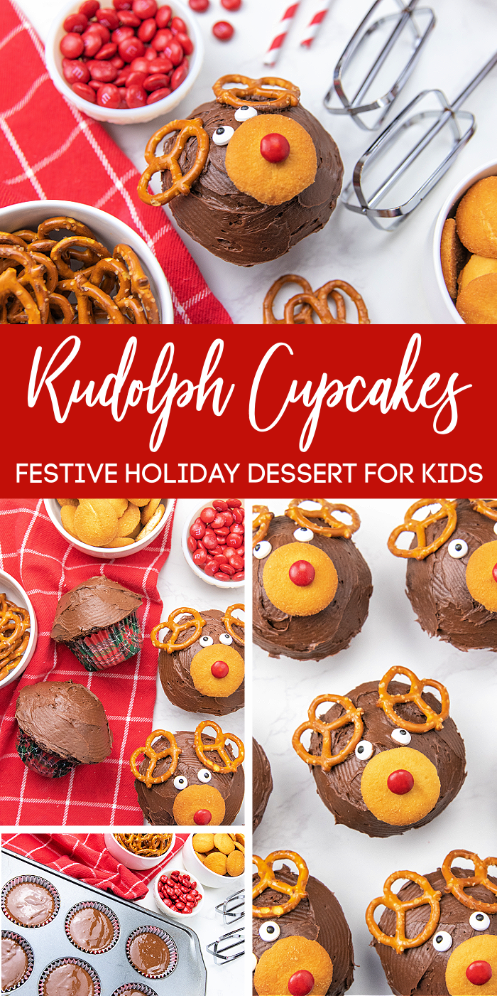 These Rudolph Cupcakes are the cutest holiday dessert ever! You’ll love how easy they are to put together. You could easily make these for a festive gathering. Or, you could turn these cupcakes into a fun family activity and let your kiddos make the reindeer themselves! My kids had a blast pressing on the pretzels and gluing on the reindeer noses with chocolate frosting.