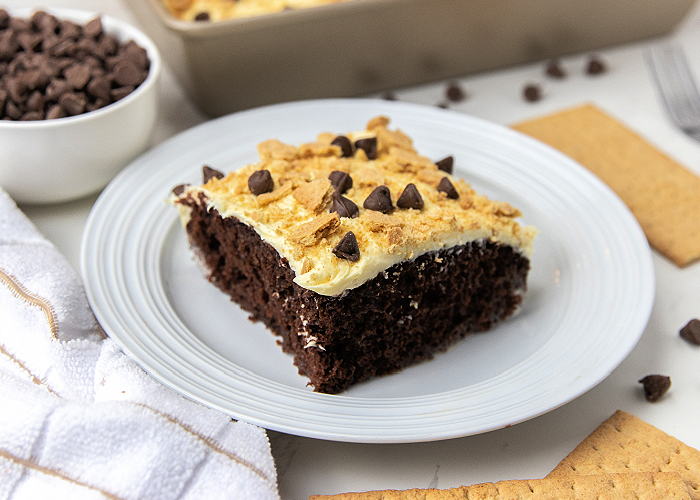 This S’Mores Poke Cake really does taste like your favorite campfire dessert, but without the gooey mess! I love making this during camping season, during the summer, or to take to church events. It is such a crowd-pleaser because everyone likes graham crackers, chocolate, and marshmallow cream!