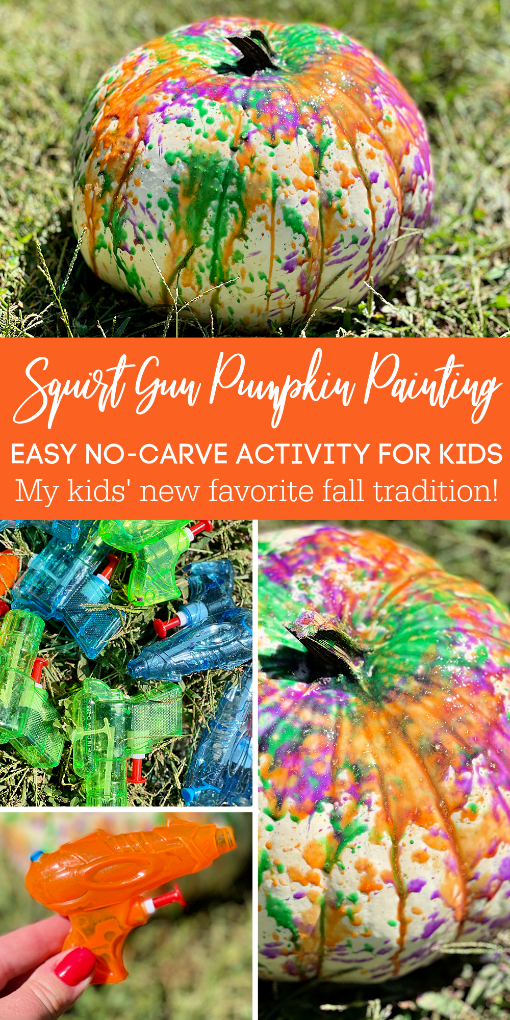 Squirt gun pumpkin painting for kids is a great no-carve Halloween activity for Fall! It's a great way to get kids outside and creative at the same time!
