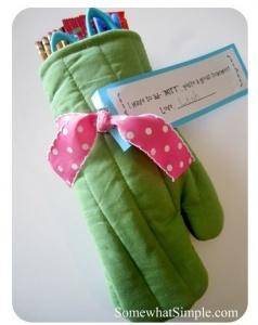 Add some school supplies to the inside of an oven mitt and add a note that says “I have to ad-MITT, you’re the best teacher”. You can find out ahead of time what supplies your kids’ teacher may be in need of, or just include some extra items you have in your stockpile.