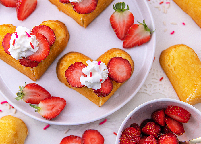 - Place the sliced strawberries on top of each Twinkie heart. Add whipped cream on top. Garnish with valentine sprinkles, if desired.