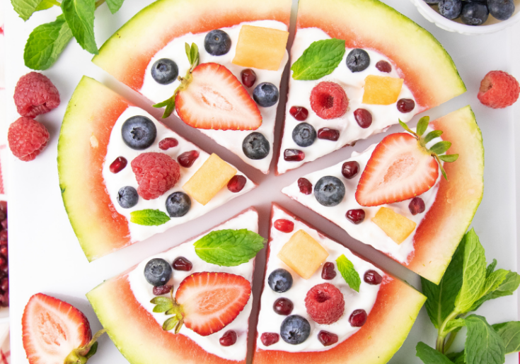 Serve up this healthy and delicious watermelon pizza. A watermelon that is topped with yogurt, fresh fruit, and served as a slice of pizza. The ultimate summer dessert that takes minutes to assemble.